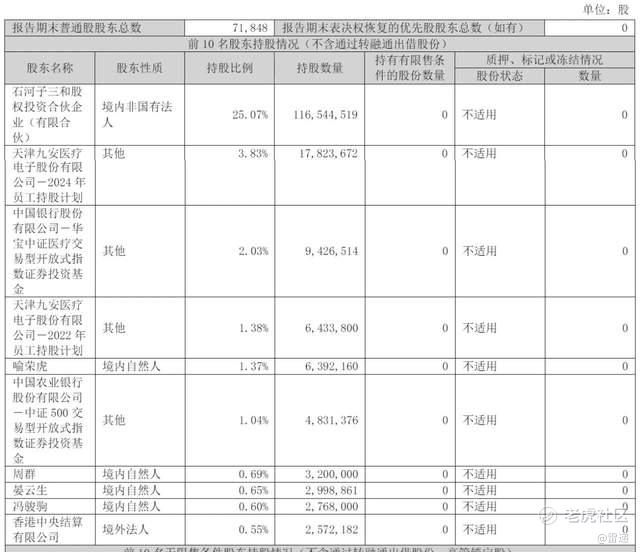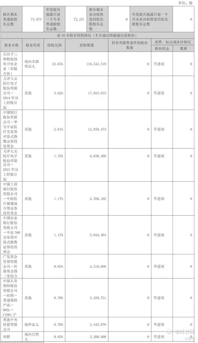 截至2024年12月31日,刘毅通过石河子三和股权投资合伙企业(有限合伙)持股为23.65%,天津九安医疗电子股份有限公司-2024 年员工持股计划持股为3.62%,中国银行股份有限公司-华宝中证医疗交易型开放式指数证券投资基金持股为2.61%;