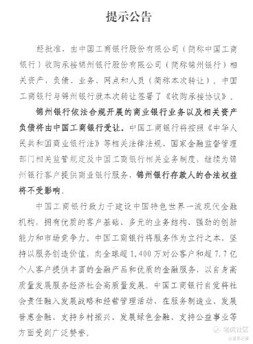 10月26日,锦州银行官网一纸公告,宣告了一个时代的结束。经国家批准,工商银行将正式收购承接锦州银行的全部“家当”——资产、负债、业务、网点,乃至员工,统统由工商银行接盘。