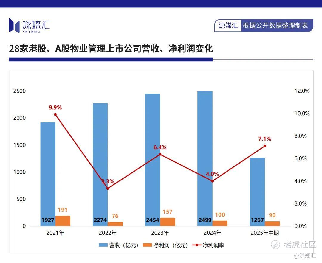 wind数据显示,28家港股、A股物业管理上市公司,总营收从2021年的1927亿元上涨到2024年的2499亿元,2025年中期为1267亿元;但净利润率却呈断崖式下跌走势,从9.9%跌至4.0%,2025年中期为7.1%。