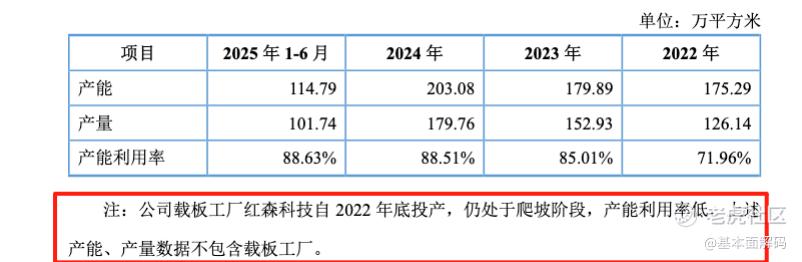 红板科技在《招股书》和《一轮回复》中均披露,其新投产的“红森科技”(载板工厂)自2022年底投产以来,因“产能尚处于爬坡阶段,固定生产成本较高,毛利率为负,拉低公司主营业务毛利率”。数据显示,该高端产线(类载板、IC载板)的产能利用率极低,2023年仅为3.37%,2024年仅为10.06%。