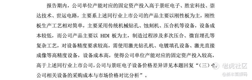 发行人与中介机构对此的解释是:“公司产品主要以HDI板为主...需使用激光钻孔机、电镀填孔设备、激光直接成像等高精度设备,设备成本高”。