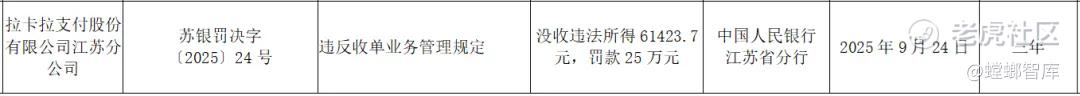 就在H股上市计划披露没多久,2025年9月,拉卡拉江苏分公司因违反收单业务管理规定,被中国人民银行江苏省分行处以罚款25万元,并没收违法所得61423.7元。