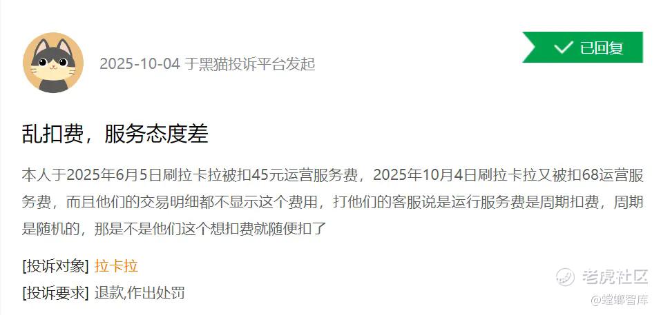 有用户反应,自己于2025年6月5日刷拉卡拉被扣45元运营服务费,10月4日刷拉卡拉又被扣68运营服务费,而交易明细上却不显示该笔费用。打电话给客服,得到的解释是运行服务费是周期扣费,周期是随机的。用户对此行为不认可,认为是拉卡拉私自扣费,要求退还该笔费用。