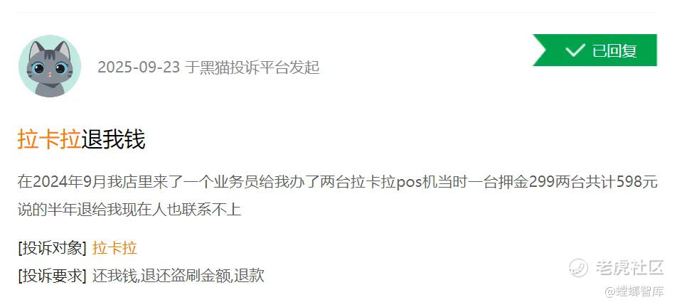 还有用户反应,自己于2024年9月办理了两台拉卡拉POS机,每台押金299元,共计598元,办理的时候承诺半年退还押金,如今半年早已过去现在却联系不上人。