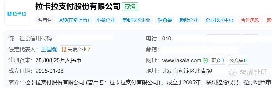 天眼查显示,拉卡拉成立于2005年1月6日,注册资本约为7.88亿元,法定代表人是王国强,董事长是孙陶然。