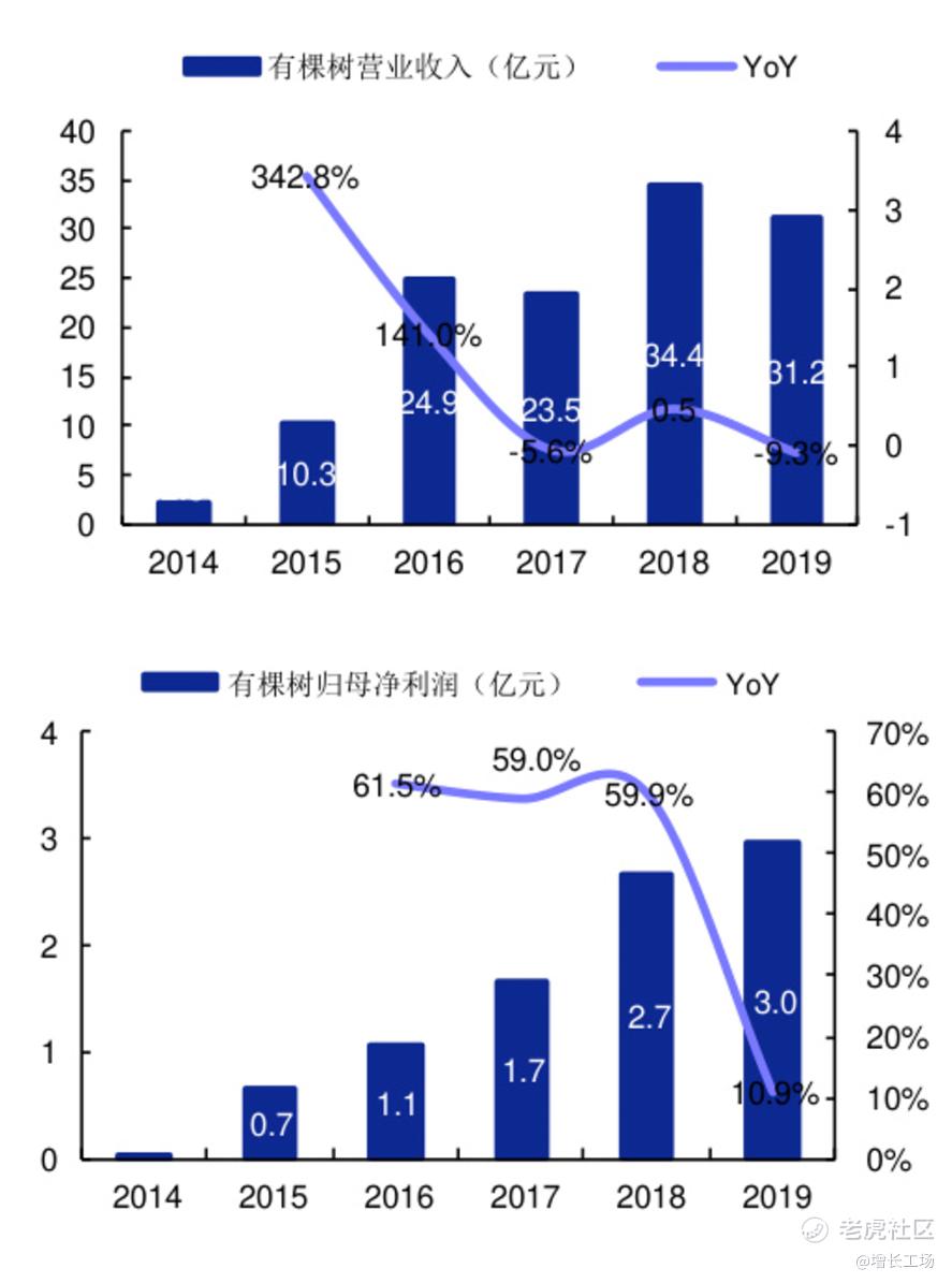 财报显示,2016年,有棵树完成营业收入24.9亿元,比2015年上涨幅度达到141%,并自2014年起持续三年增长速度维持100%以上,变成2016年纯利润破亿的标杆企业。