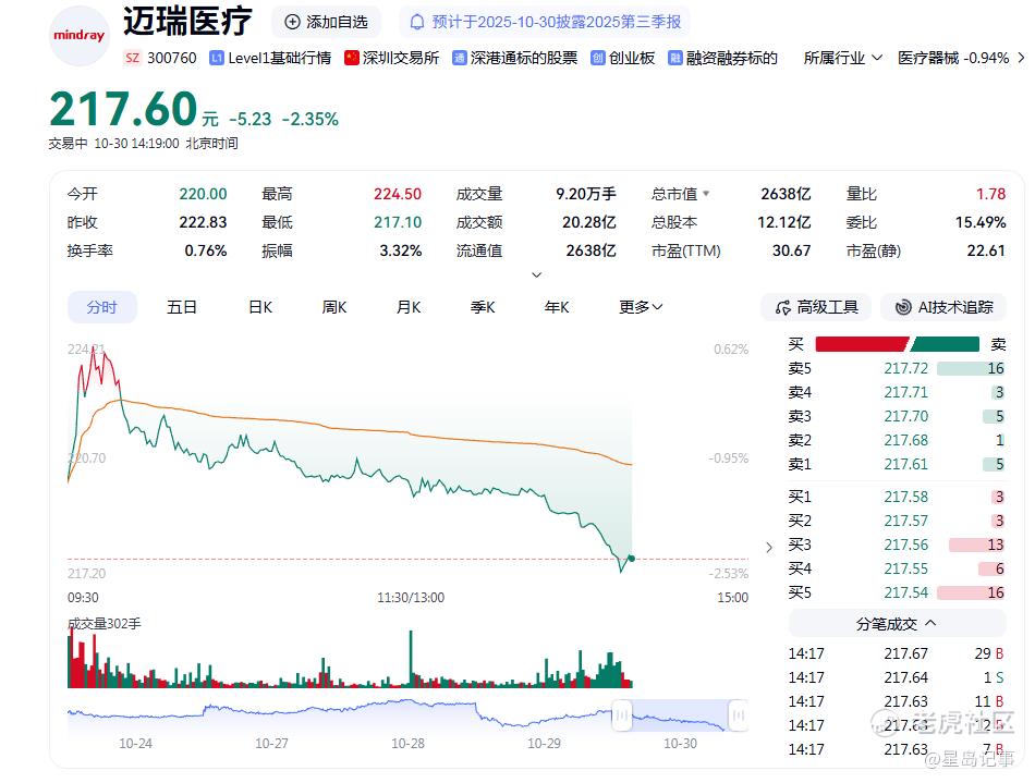 当日,迈瑞医疗开盘价为220元/股,较前一日收盘价跌幅1.27%。截至发稿,迈瑞医疗股价报217.6元/股,跌幅2.35%,总市值2638亿元。