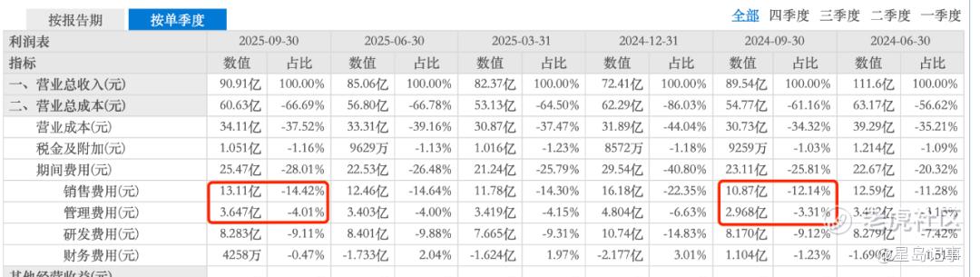 其中销售费用从2024年第三季度的10.87亿元增长至13.11亿元,同比增幅达20.61%;管理费用从2.97亿元增加到了3.65亿元,同比增幅22.9%,远超同期的收入增幅。