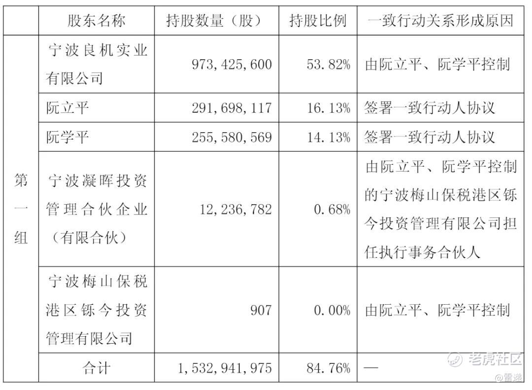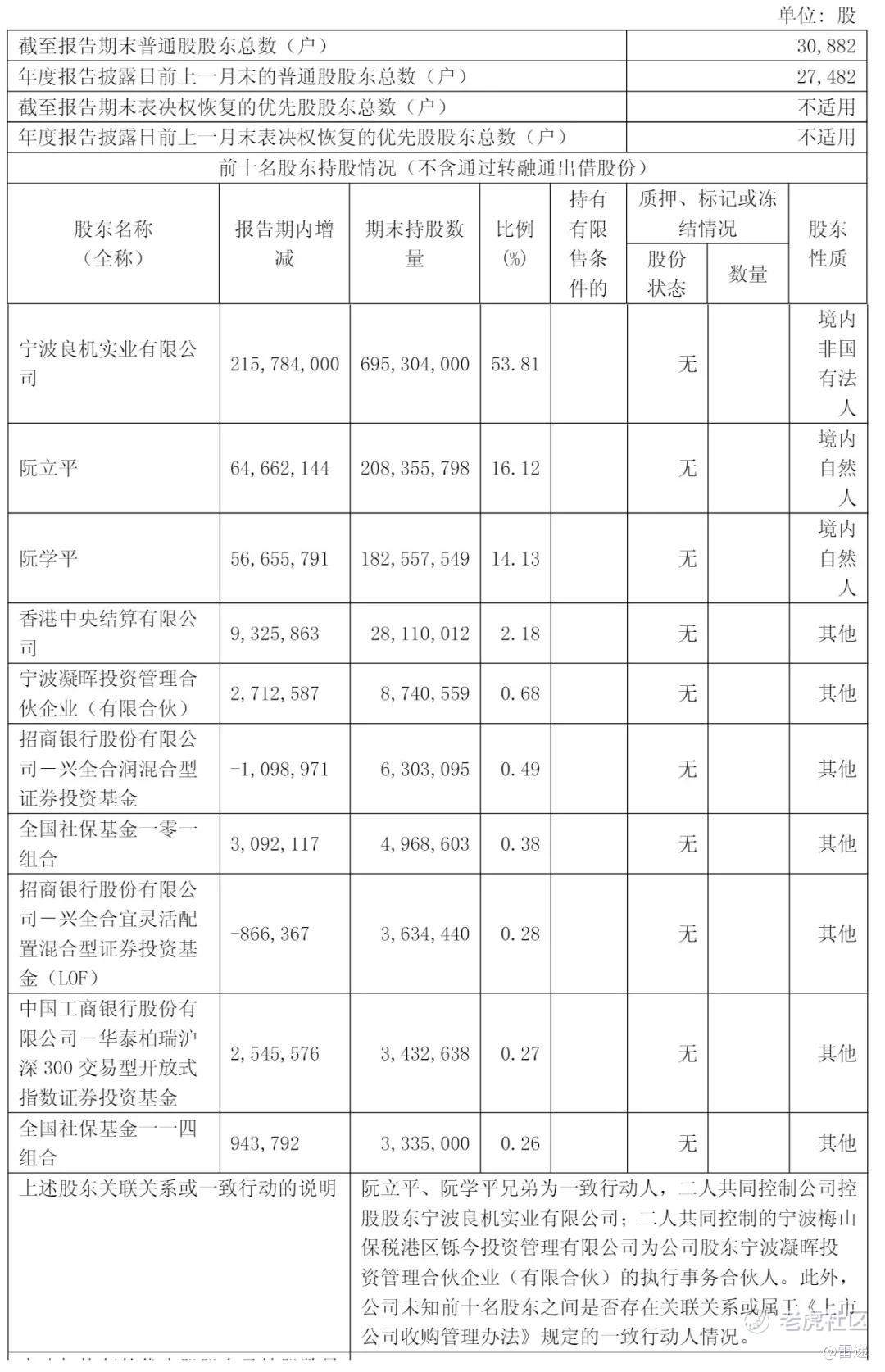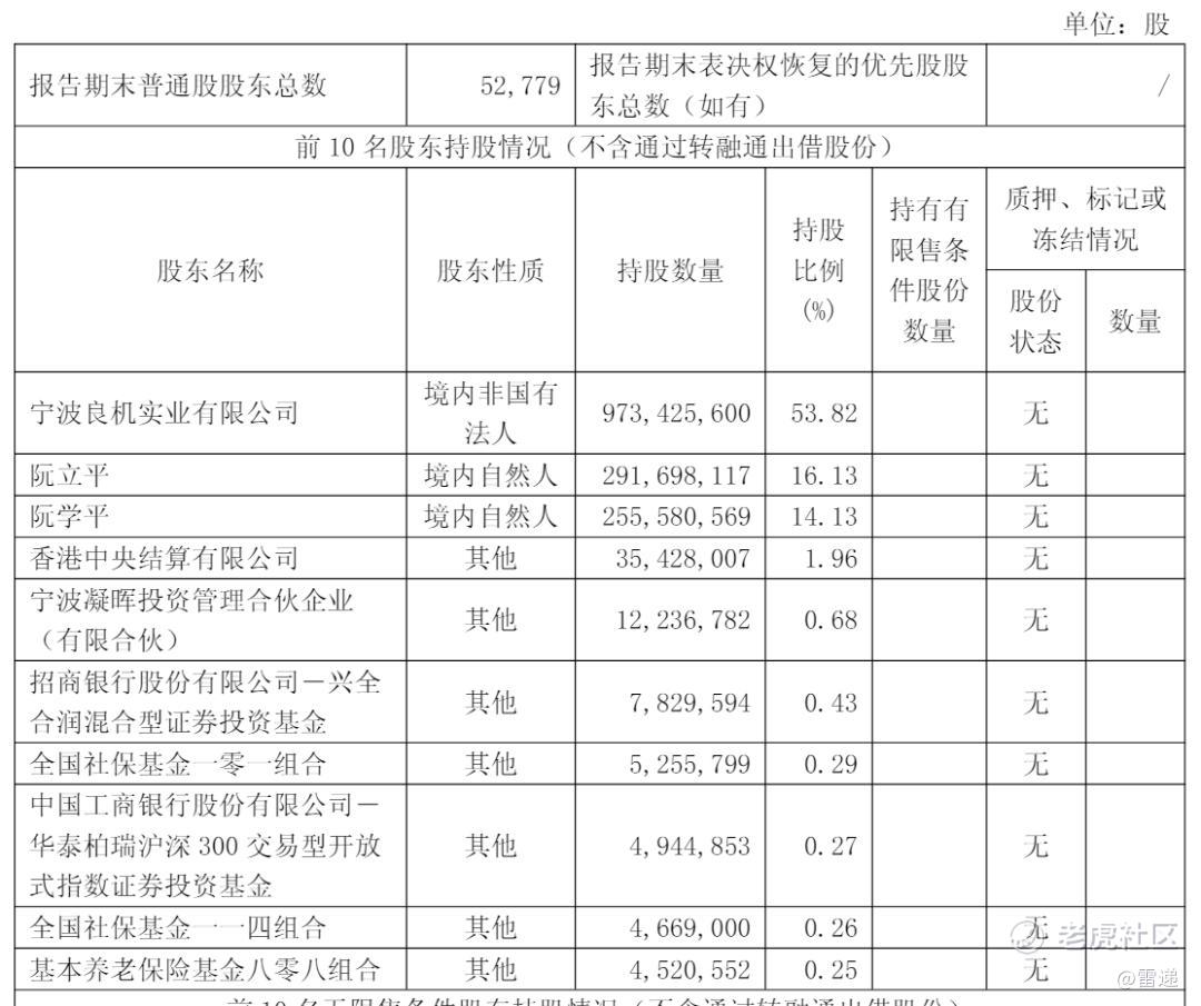截至2024年12月31日,宁波良机实业有限公司持股为53.81%,阮立平持股为16.12%,阮学平持股14.13%,香港中央结算有限公司持股为2.18%,宁波凝晖投资管理合伙企业(有限合伙)持股0.68%,招商银行股份有限公司-兴全合润混合型证券投资基金持股为0.49%;