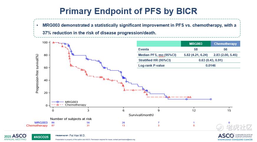 根据乐普生物在2025年ASCO大会上公布的最新研究结果显示,共有173例复发/转移性鼻咽癌患者被随机分配至维贝柯妥塔单抗(n=86)或化疗组(n=87),两组既往中位治疗线数均为三线,分别有46.5%和47.1%的患者基线存在肝转移,临床预后较差。截至2024年6月30日,维贝柯妥塔单抗组经BICR评估的ORR为30.2%,化疗组ORR为11.5%,数值近三倍提升,两组的中位PFS分别为5.82和2.83个月,显著降低疾病进展或死亡风险37%(HR=0.63,P=0.0146)。