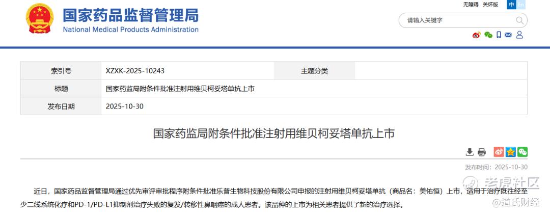 10月30日,国家药品监督管理局(NMPA)官网显示,乐普生物的注射用维贝柯妥塔单抗(MRG003)获批上市,用于治疗既往经至少二线系统化疗和PD-1/PD-L1抑制剂治疗失败的复发或转移性鼻咽癌(NPC)患者。