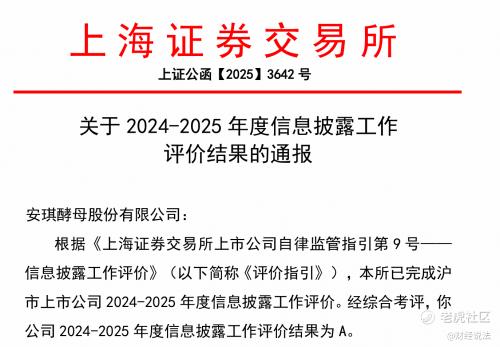 近日,上海证券交易所发布了《沪市上市公司2024至2025年度信息披露工作评价结果》,安琪酵母再次获得A级(优秀)评价。在参与评价的2263家上市公司中,仅430家获此评级,占比约19%。这已是公司第九次获评A级,充分体现了监管机构与资本市场对公司在公司治理、规范运作及投资者关系管理等方面工作的高度认可。