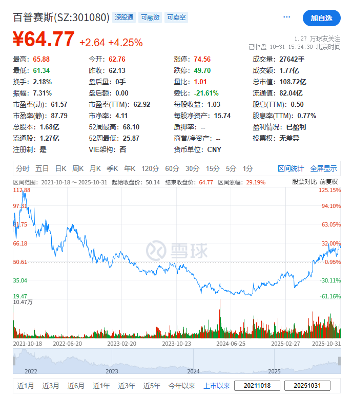 百普赛斯(301080.SZ)于2021年10月18日在深交所挂牌上市,截至午间收市(2025年10月31日)其总市值约108.72亿元人民币。