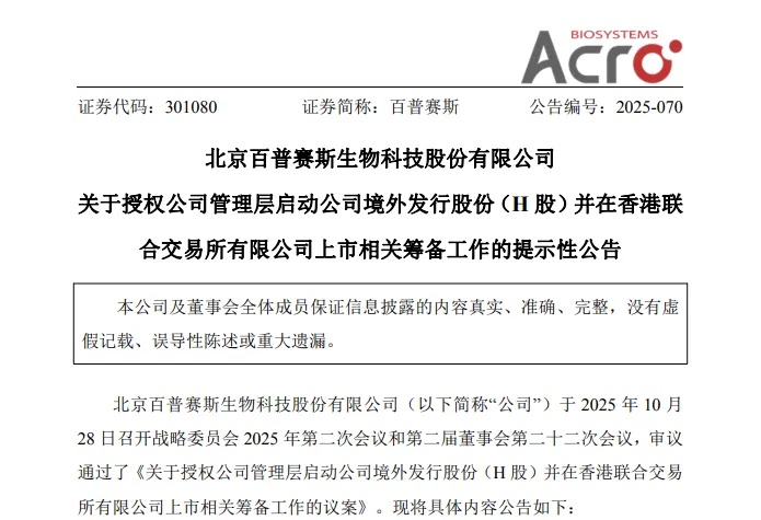 来自北京的A股上市公司百普赛斯(301080.SZ)发布公告称,为进一步推动国际化战略落地,加强海外业务布局,拓宽海内外并购和融资渠道,提高公司国际知名度,提高公司整体竞争力,根据公司总体发展战略及运营需要,公司拟在境外发行股份(H股)并在香港联合交易所有限公司上市。公司董事会同意授权公司管理层启动本次H股发行上市的相关前期筹备工作。