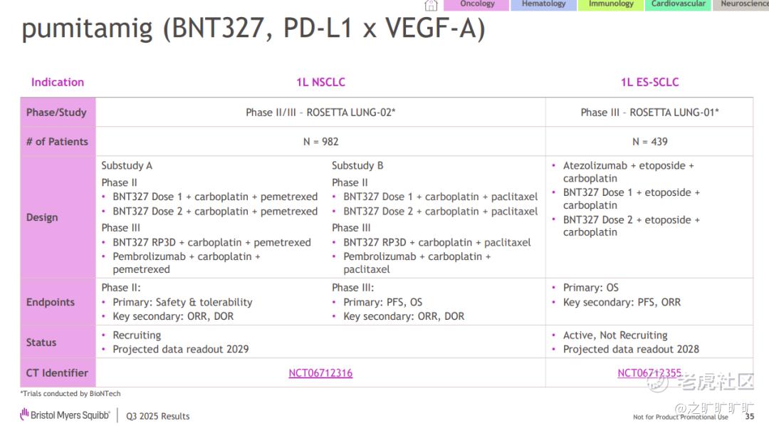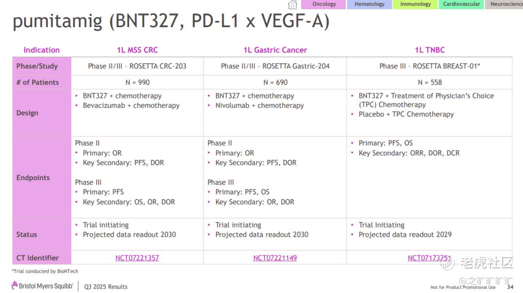 q3 iza-bren (百利天恒的egfr/her3 adc) 增加了egfrmut nsclc (post-tki) 跟post-io UC,并进一步更新了BNT327 (PD-L1/VEGF) / pumitamig的布局,vs q2增加了mss crc跟gc,同时tnbc更新了p3 plan: