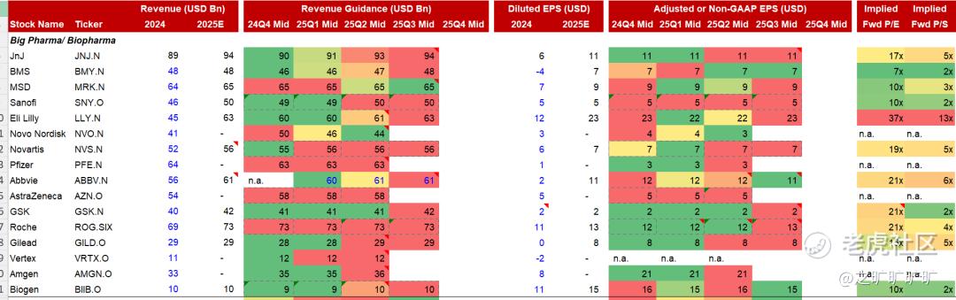 notes: 1) 个别公司因为口径问题,其实是guide up,比如abbv (没去深究,直接按公司季报表述来了....);2) P/E, P/S其实是按25年业绩算的;3) 贵有贵的道理,便宜有便宜的道理,大体上都对的上 (roche: 不嘻嘻,10/10至今已经-11cm了)...;4) regn lack of guidance again