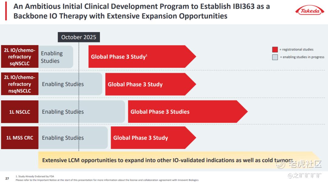 顺便提一嘴takeda/innovent的肺癌,1L nsclc (nsq/sq;PD-L1 exp也许不限?细节:“studies”,而不是“study”),2L sq跟nsq,其中2L sq是25年7-8月注册的那个?同时也布局了crc,这次tak直接抬到1L crc了...