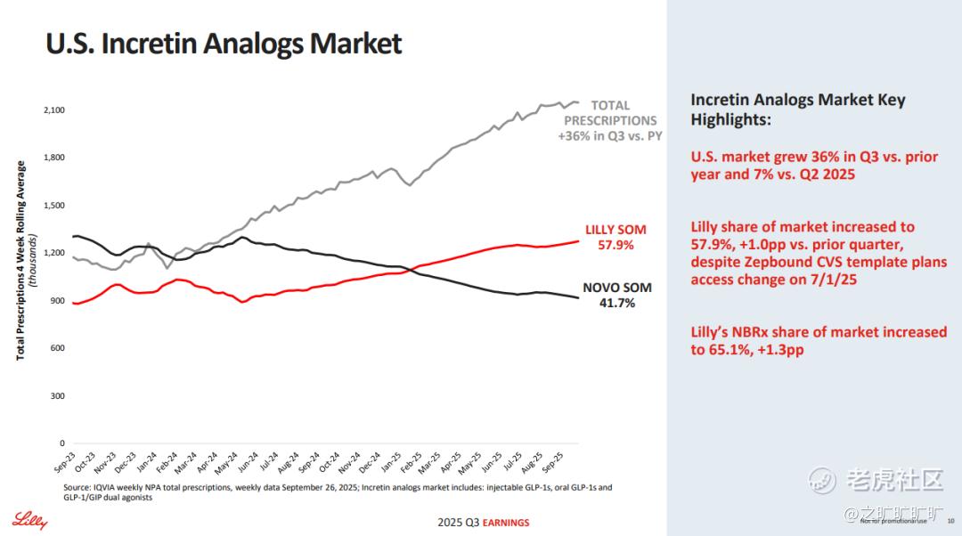 迎接,你们的,新王!3q25 tirz 10.1b (vs keytruda 8.1b, 甚至3q25还是miss), 其中,mounjaro (6.5b,US 3.55b; +1b), zepbound (3.6b,几乎都是US卖出来的; +247m),美国市场继续吊打novo;当天股价都还是有正反馈的...
