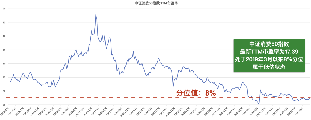 截至2025年10月31日,中证消费50指数市盈率为17.39,位于2019年3月以来8%的分位值处,属于低估状态。