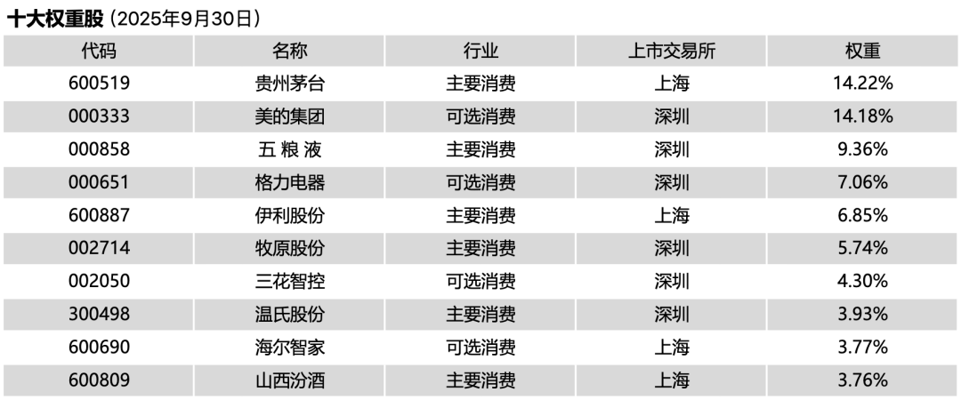 中证消费50指数的权重相对较为集中,贵州茅台、美的、五粮液、格力和伊利这五大成分股合计共占指数超过一半的权重。前十大成分股共占指数约七成的权重。