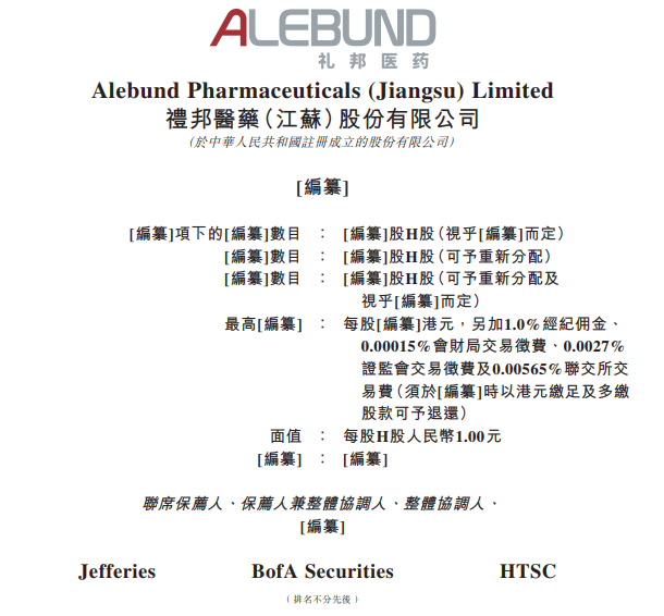 2025年10月31日,来自江苏扬州邗江区高新区的礼邦医药(江苏)股份有限公司Alebund Pharmaceuticals (Jiangsu) Limited(下称礼邦医药)在港交所递交招股书,拟在香港主板上市。
