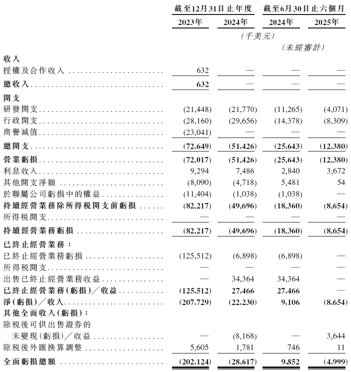 招股书显示,在过去的2023年、2024年和2025年前六个月,新桥生物的营业收入分别63.2万美元、0美元、0美元,相应的研发开支为2,144.8万、2,177.0万和407.1万美元,相应的持续经营业务亏损分别为8,221.7万、4,969.6万和865.4万美元。