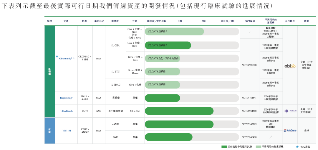 新桥生物已完成了I期临床研究的1a期部分以及1b期剂量递增研究的安全性评估,将于2026年初启动一项随机II期研究,于2025年8月提交临床试验方案后,公司未收到美国FDA对givastomig用于CLDN18.2阳性及PD-L1阳性GEA患者的II期联合治疗试验的任何反对或担忧。除givastomig外,截至最后实际可行日期,新桥生物已建立包含三个临床阶段项目的管线,包括两个肿瘤项目uliledlimab及ragistomig,以及眼科项目VIS-101。