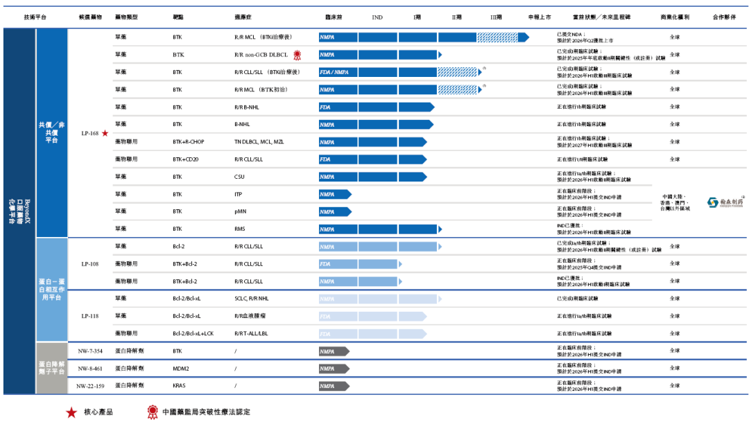 麓鹏制药目前处于NDA阶段的核心产品LP-168(洛布替尼)是全球业界首个且唯一兼具“共价与非共价”结合模式的BTK抑制剂,具备同类最佳潜力。LP-168已在多种肿瘤与自体免疫疾病适应症中展现临床效益,包括复发/难治性(R/R)套细胞淋巴瘤(MCL)、复发/难治性非GCB弥漫大B细胞淋巴瘤(DLBCL)与复发/难治性慢性淋巴细胞白血病/小淋巴细胞淋巴瘤(CLL/SLL)。LP-168 在中国获得了首个且唯一的针对非GCB DLBCL的突破性疗法认定(BTD),有望成为首款获批用于治疗该最常见非霍奇金淋巴瘤亚型的BTK抑制剂单药疗法。此外,LP-168用于治疗使用过共价BTK抑制剂的R/R MCL患者的NDA已获国家药监局受理。公司还计划在R/R CLL/SLL患者中启动LP-168对照已获批BTK抑制剂的全球III期头对头试验,以支持美国FDA注册。