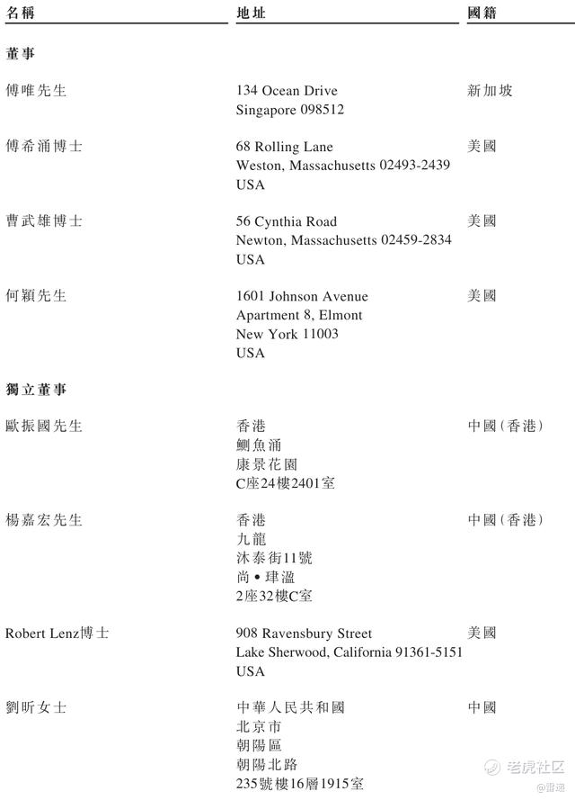 傅唯为新加坡籍,傅希涌博士、曹武雄博士、何颖均为美国籍。