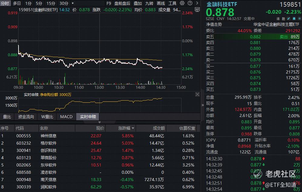 热门ETF方面,百亿金融科技ETF(159851)场内价格下挫2%,失守5日、10日、20日短期均线,场内频现溢价交易,资金实时净申购3000万份。