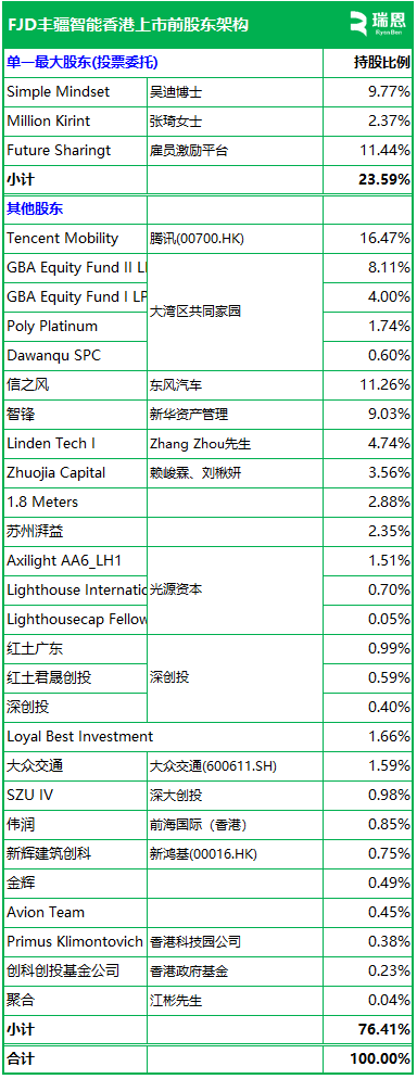 吴迪博士通过Simple Mindset持股9.77%,通过投票委托协议可控制张琦女士旗下Million Kirint、雇员激励平台Future Sharingt所持的2.37%、11.44%股份,合计持股约23.59%,为单一最大股东。