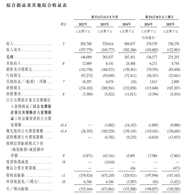 招股书显示,在过去的2022年、2023年、2024年和2025年前六个月,丰疆智能的营业收入分别为人民币5.04亿、5.30亿、5.70亿和3.58亿元,相应的净亏损分别为人民币3.33亿、4.71亿、3.34亿和1.51亿元。