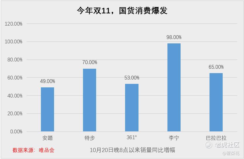 特卖平台唯品会国货数据同样亮眼:自10月20日晚8点开启后,特步成交额同比涨70%,李宁98%,361°、安踏分别增长 53% 和 49%,童装品牌巴拉巴拉也涨了65%。