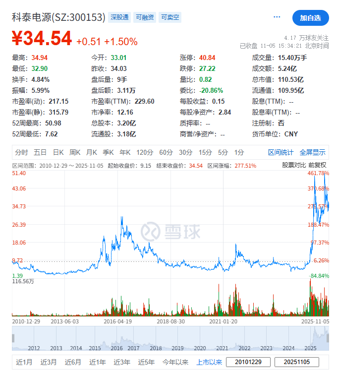 科泰电源(300153.SZ)于2010年12月29日在深交所挂牌上市,截至周三(2025年11月5日)收市,其总市值约110.53亿元人民币。