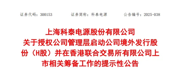 来自上海青浦区的A股上市公司科泰电源(300153.SZ)发布公告称,根据公司总体发展战略及运营需要,为深入推进国际化战略,满足海外业务布局需要,提升公司国际品牌知名度及综合竞争力,加强与境外资本市场对接,公司拟筹划在境外发行股份(H股)并申请在香港联合交易所有限公司挂牌上市,提请公司董事会授权公司管理层启动本次H股发行上市的前期筹备工作。截至目前,本次H股发行上市的相关细节尚未确定。