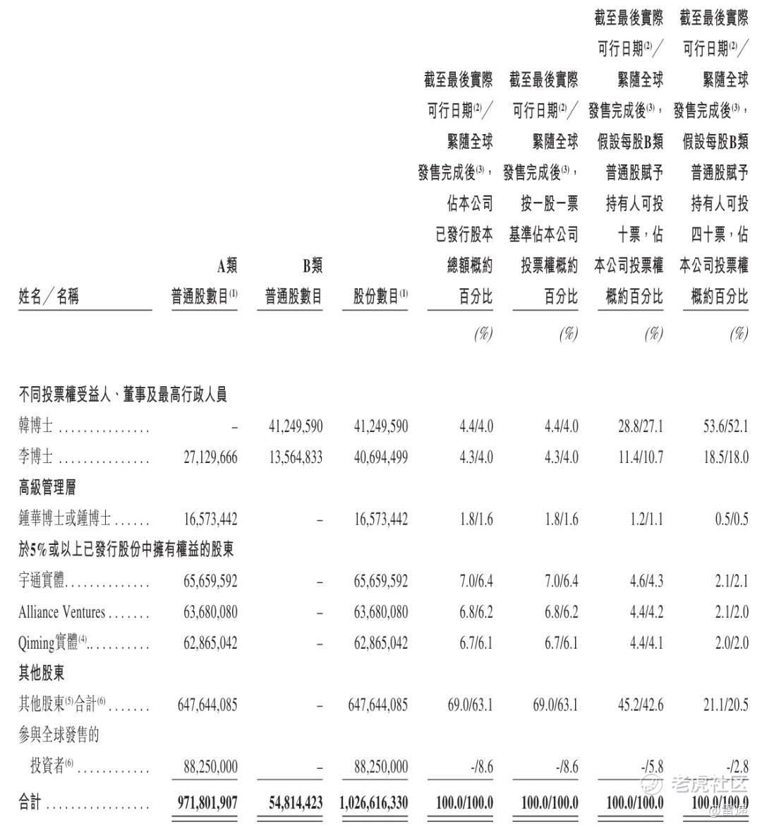 IPO前,韩旭博士通过XHL及THL持有41,249,590股B类普通股的权益,约占公司已发行股本总额的4.40%,及公司投票权的53.64%;李岩博士通过Humber Partners持有27,129,666股A类普通股和13,564,833股B类普通股的权益,约占公司已发行股本总额的4.3%,及公司投票权的18.5%(基于每股A类普通股赋予持有人可投一票及每股B类普通股赋予持有人可投40票计算);上述创始人和联合创始人合计持有公司投票权的72.1%,形成了稳固的管理层控制权。