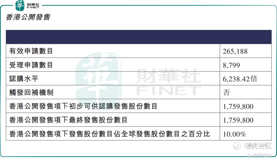 根据公告,香港公开发售方面,旺山旺水获6238.42倍认购,香港公开发售的发售股份最终数目为175.98万股股份,占发售股份总数的约10%。合共接获约26.5万份有效申请,受理申请数目8799份。