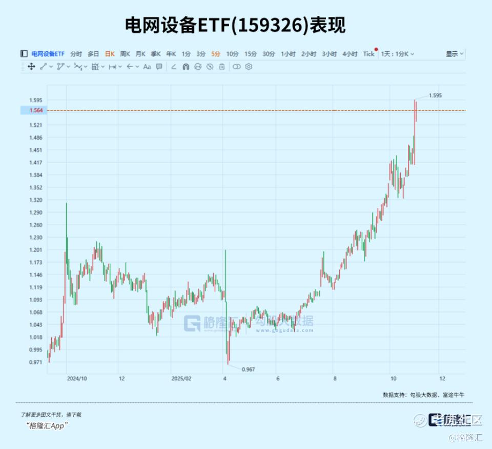 而连续几日的大幅拉升,电网设备ETF(159326)在近两个交易日飙涨7.86%,今日成交额8.29亿元,换手率高达69.32%。
