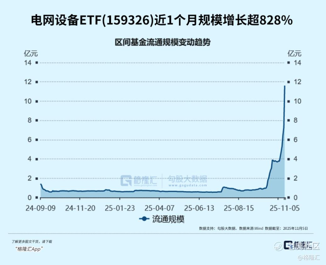 电网设备ETF(159326)昨日吸金3.98亿元,近5日资金净流入超7亿元,最新规模11.61亿元,近1个月规模增长超828%。