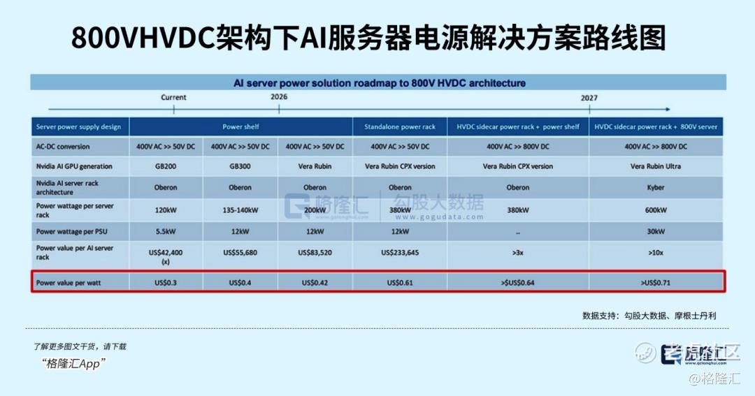 大摩预计,到2027年,为RubinUltra机柜(采用Kyber架构)设计的电源解决方案,其单机柜价值将是当前GB200服务器机柜的10倍以上。同时,到2027年,AI服务器机柜中每瓦功耗对应的电源方案价值,也将比现阶段翻倍。