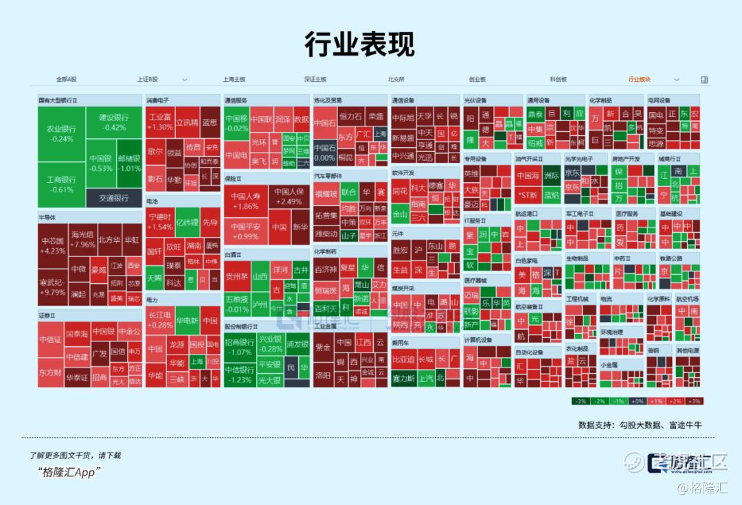 行业板块呈现普涨态势,化肥行业、有色金属、能源金属、电源设备、半导体、电机板块涨幅居前,船舶制造、旅游酒店、文化传媒、商业百货板块跌幅居前。