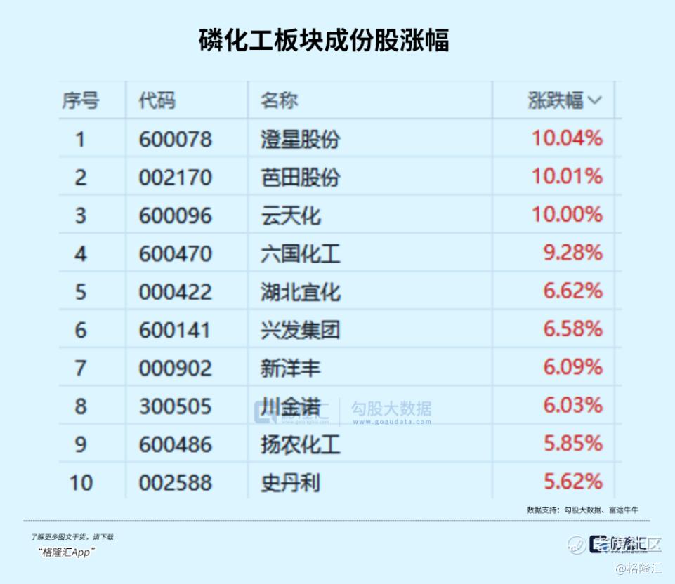 磷化工板块涨幅居前,清水源20cm涨停,澄星股份、芭田股份亦封板,云天化、川金诺、六国化工等多股跟涨。