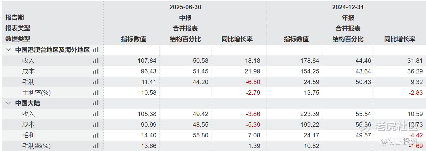 从收入构成来看,2025年上半年大陆与海外收入分别为105亿和108亿,各占50%左右,非常均衡。