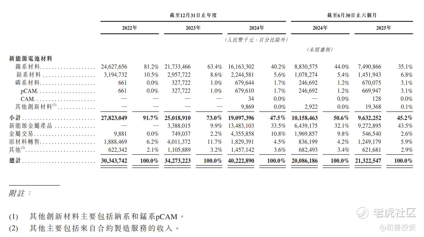 目前中伟股份核心收入来源为新能源金属产品、镍系材料、钴系材料、磷系材料,2025年上半年收入金额分别为92.73亿、74.91亿、14.52亿和6.7亿元,占比分别为43.5%、35.1%、6.8%和3.1%。其中镍系材料是公司核心收入来源,新能源金属短短三年内成为公司第一大收入来源,这个我们后面细说。