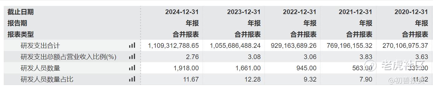 从研发支出来看,从2020年的2.7亿增长至2024年的11.09亿,占营业收入的比例为2.76%。