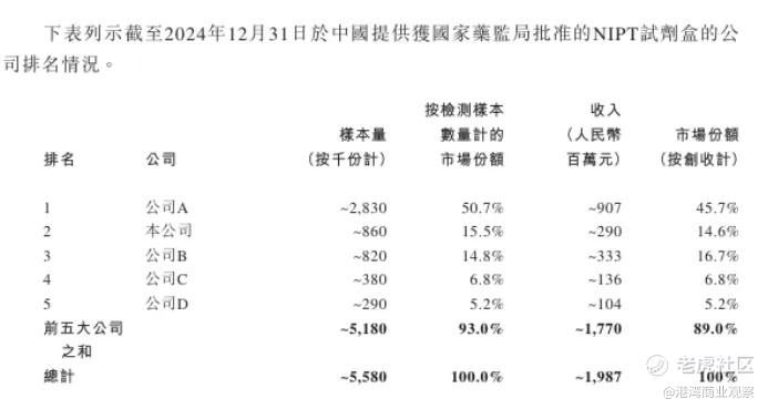 安诺优达NIPT试剂盒(旨在检测三种最常见的染色体疾病(21、18及13三体综合征))于2017年获得三类医疗器械证书。根据灼识谘询的资料,按样本检测量计量,于2024年,公司在中国NIPT市场位列第二,于2022年、2023年及2024年的市场份额持续增长,分别为11.6%、12.1%及15.5%。此外,按收入计,公司于中国NIPT市场排名第三,市场份额为14.6%。
