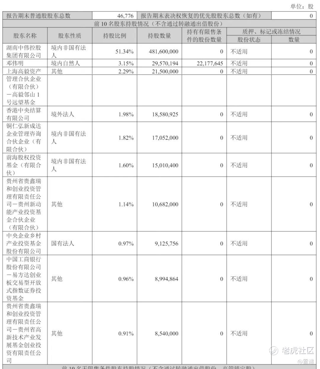 截至2025年9月30日,湖南中伟控股集团有限公司持股为51.34%,邓伟明持股为3.15%,上海高毅资产管理合伙企业(有限合伙)-高毅邻山 1号远望基金持股为2.29%,香港中央结算有限公司持股为21.98%,铜仁弘新成达企业管理咨询合伙企业(有限合伙)持股为1.82%,前海股权投资基金(有限合伙)持股为1.6%;