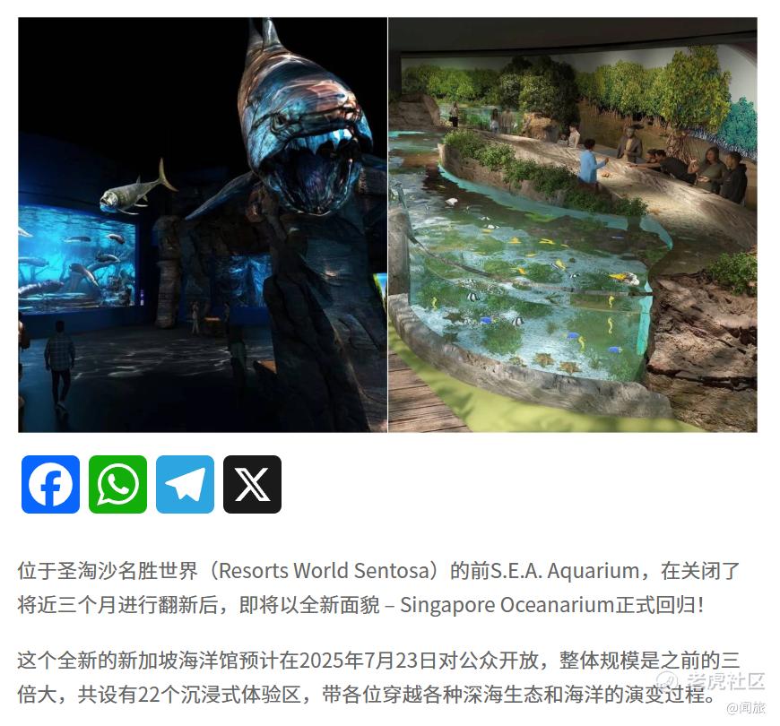 今年7月正式对外开放的新加坡海洋生态馆由备受欢迎的S.E.A.海洋馆升级扩建而成,将沉浸式叙事与前沿互动科技相融合。观景焦点“广阔海洋”展区设36米宽的观景窗,让游客可近距离观看蝠鲼与斑马鲨在水中穿梭的姿态,是全馆最能让人静下来的区域。