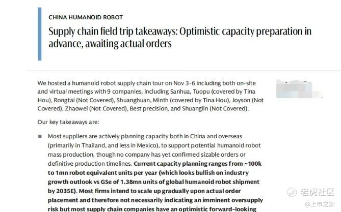 尽管产能规划雄心勃勃,但报告明确指出,所有受访企业均未确认任何大规模订单或明确量产时间表。"将根据客户实际订单逐步扩产"成为行业共识,这种谨慎态度折射出供应链在乐观预期与现实需求间的平衡艺术。高盛分析认为,当前市场对部分企业的收入预期可能过于乐观。