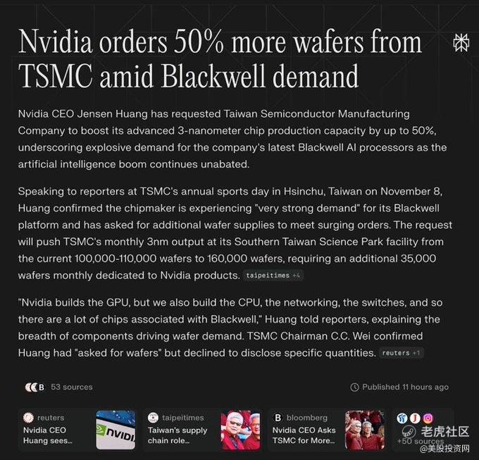 消息面上,英伟达释放出对未来需求的极度乐观信号:公司已要求台积电将新一代 Blackwell芯片 的月产量提高50%,从原定的10万片跃升至16万片,其中3.5万片晶圆专供英伟达使用。